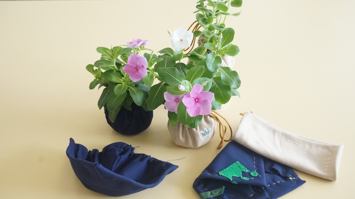 室内で育てられる土を使わない草花『花活布(はなかっぷ)』を、着られなくなった標準服を使って作ります。アップサイクルやSDGsについて学ぶことができます。