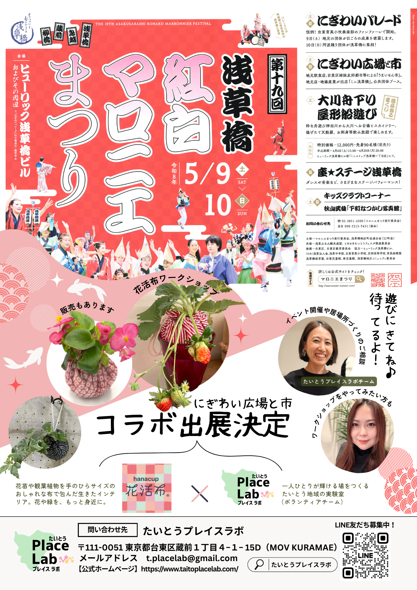 5月9日(土)、10日(日)浅草橋紅白マロニエまつり<にぎわい市>にたいとうプレイスラボさんとコラボ出店します。